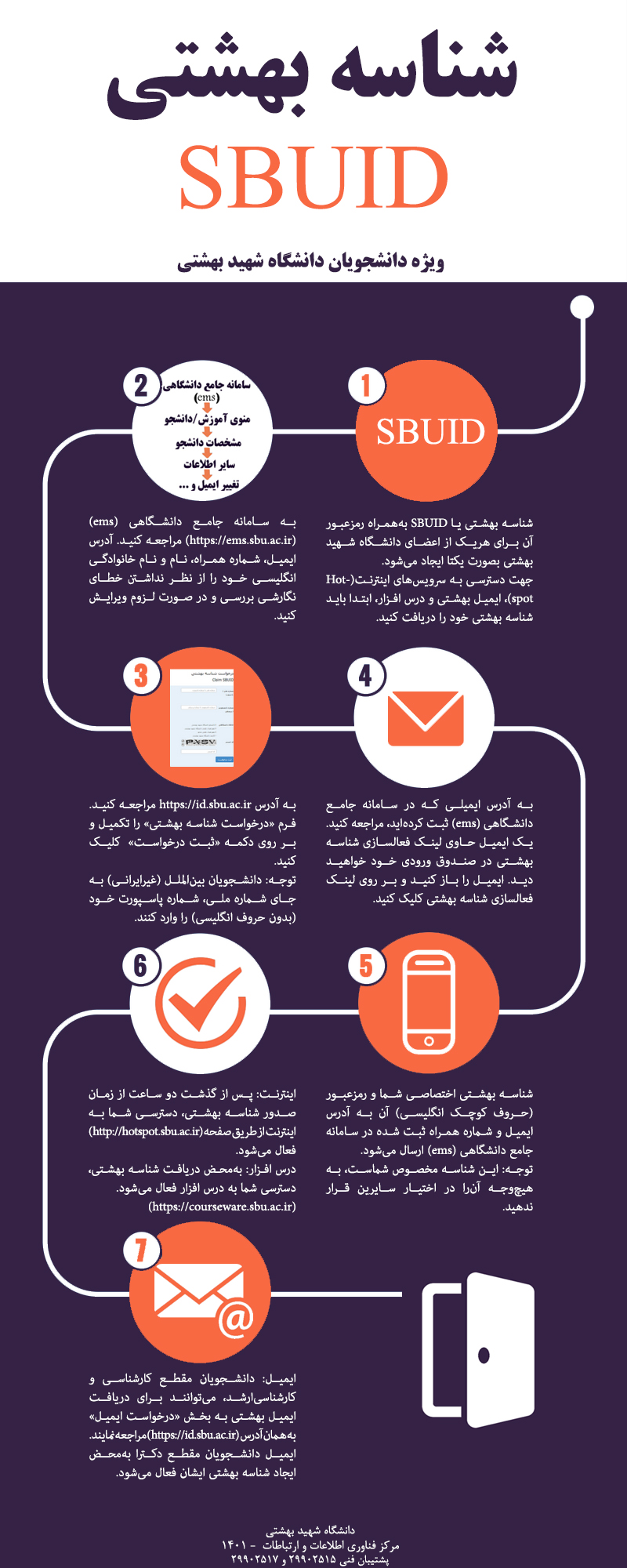 شناسه بهشتی یا «SBUID» شناسه (کلید) یکتای هر عضو دانشگاه برای دسترسی به اینترنت، سامانه اداری و مالی، ایمیل بهشتی، درسافزار و غیره است. برای دریافت شناسه بهشتی و رمزعبور آن به آدرس https://id.sbu.ac.ir مراجعه نمایید.