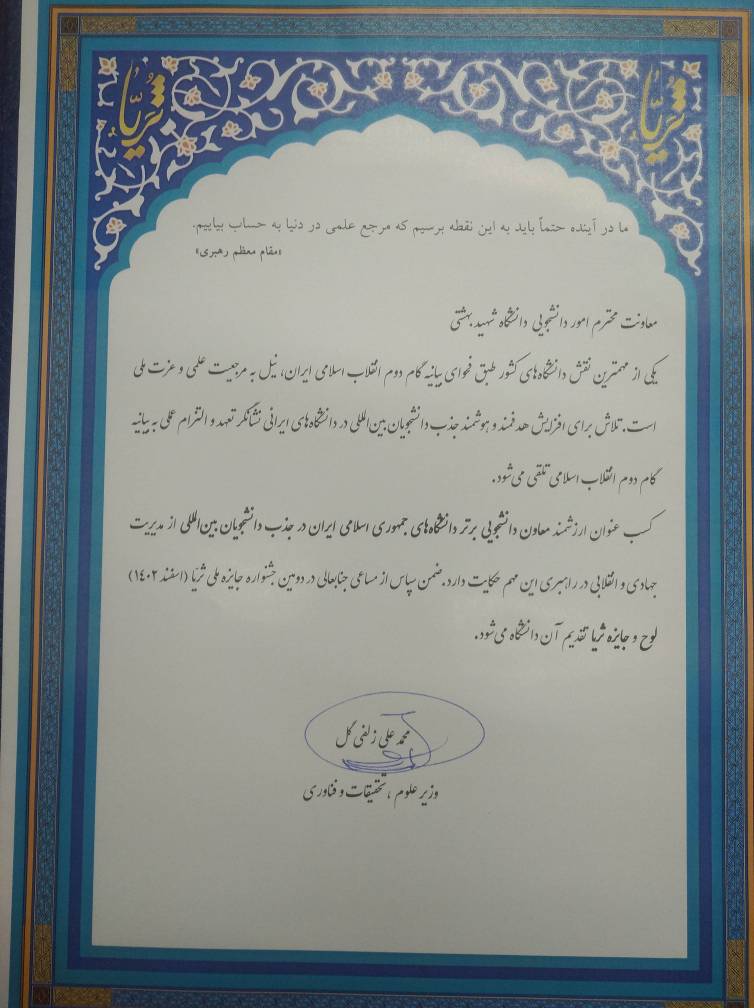 کسب عنوان ارزشمند معاون دانشجویی برتر دانشگاههای جمهوری اسلامی ایران در جذب دانشجویان بین المللی از مدیریت جهادی و انقلابی در راهبری این مهم حکایت دارد . ضمن سپاس از مساعی جنابعالی در دومین جشنواره ملی ثریا (اسفند 1402) لوح و جایزه ی ثریا تقدیم آن دانشگاه می شود .