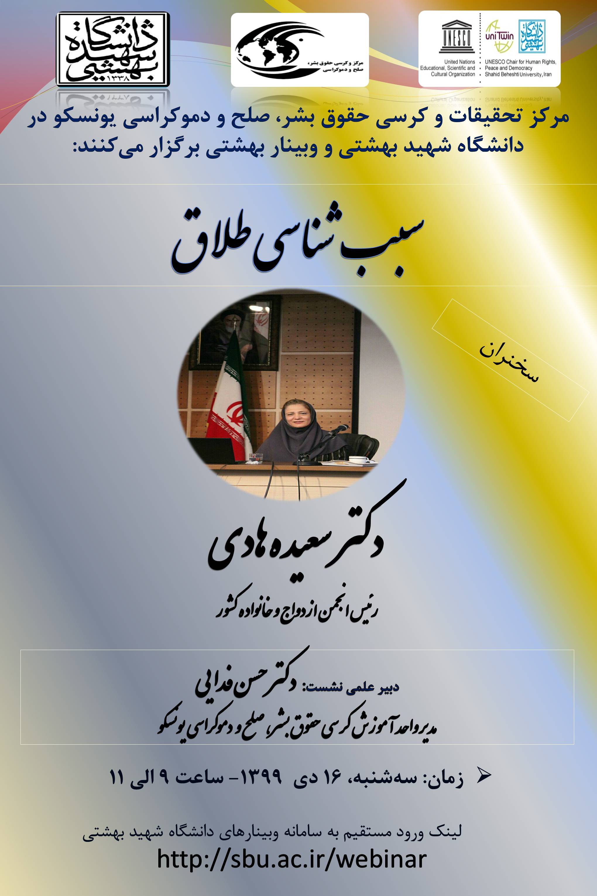 برگزاری وبینار سبب شناسی طلاق 9617 بازدید print share 16 دی به اطلاع دانشجویان، پژوهشگران و علاقمندان محترم می رساند مرکز تحقیقات و کرسی حقوق بشر، صلح و دموکراسی یونسکو در دانشگاه شهید بهشتی با...